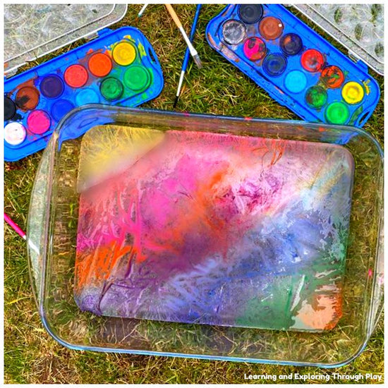 Painting on Ice with WatercoloursIt's good fun to mark make on different textures - try using watercolours on a block of ice! You will see the colours filtering down into the ice as it starst to melt.
